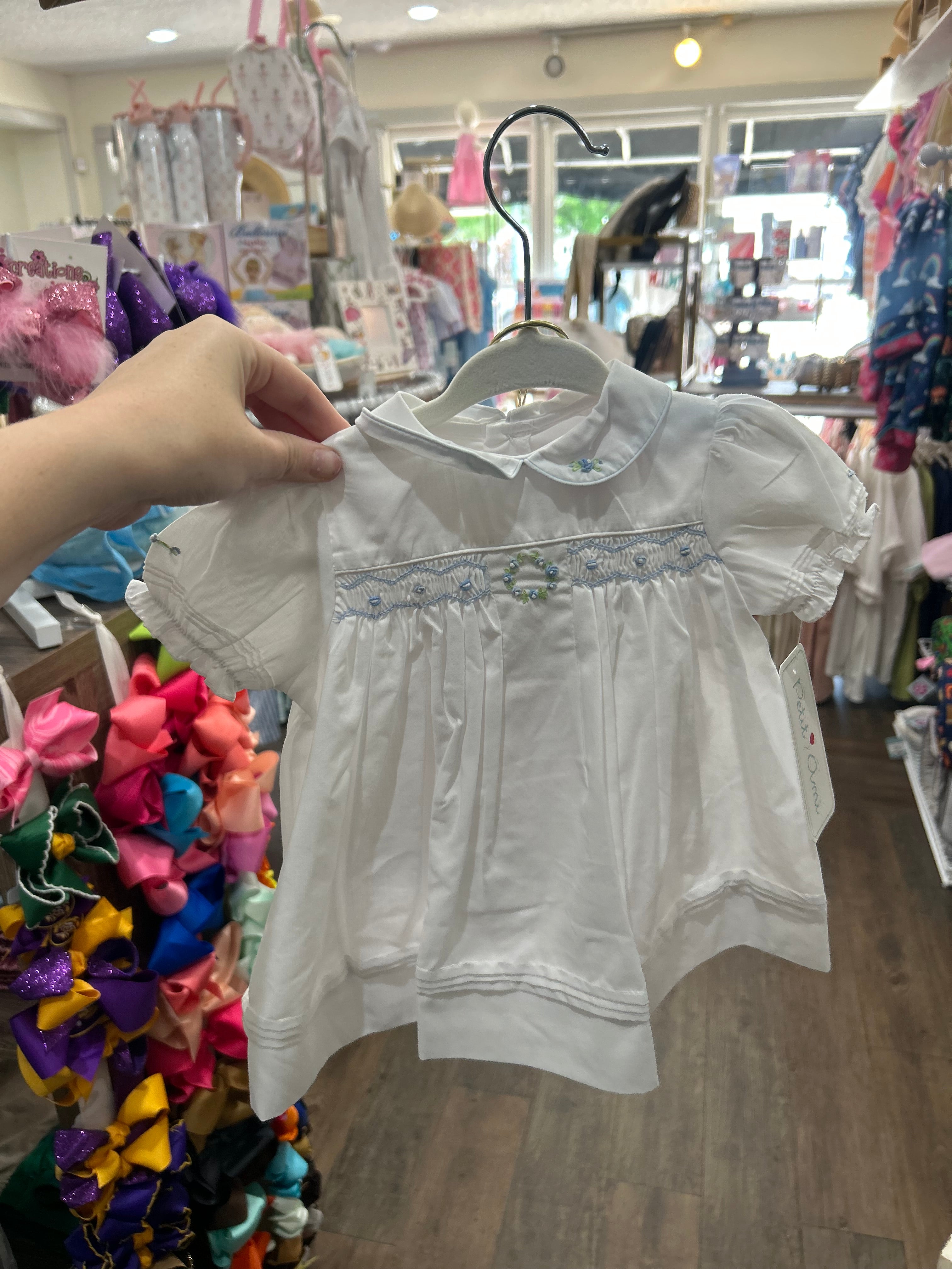 Perfect for everyday wear and simply beautiful for picture day or Easter! This short sleeve white dress is trimmed in blue details that add the perfect amount of contrast. Made with a lightweight and airy fabric that keeps little ones cool and comfortable.