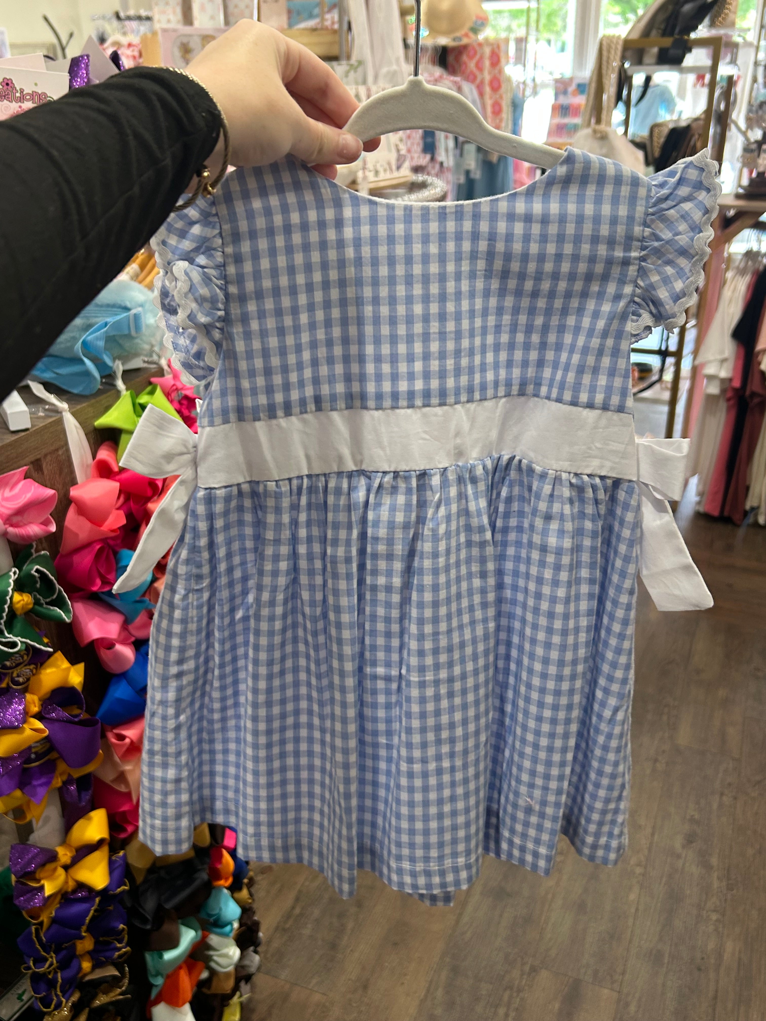 This dress is part of our Mommy & Me series. Find the matching Mom look by searching "Ladies Light Blue Gingham Ruffle Sleeve Top" in our store.