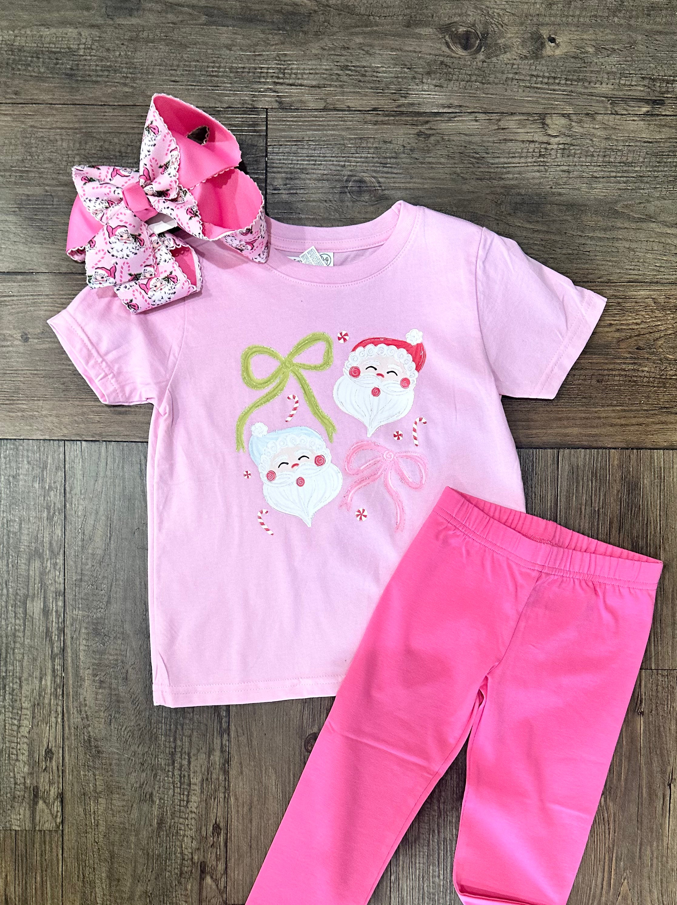 A Santa Claus and Bow design on a light pink t-shirt for girls - adorable for the Christmas season!