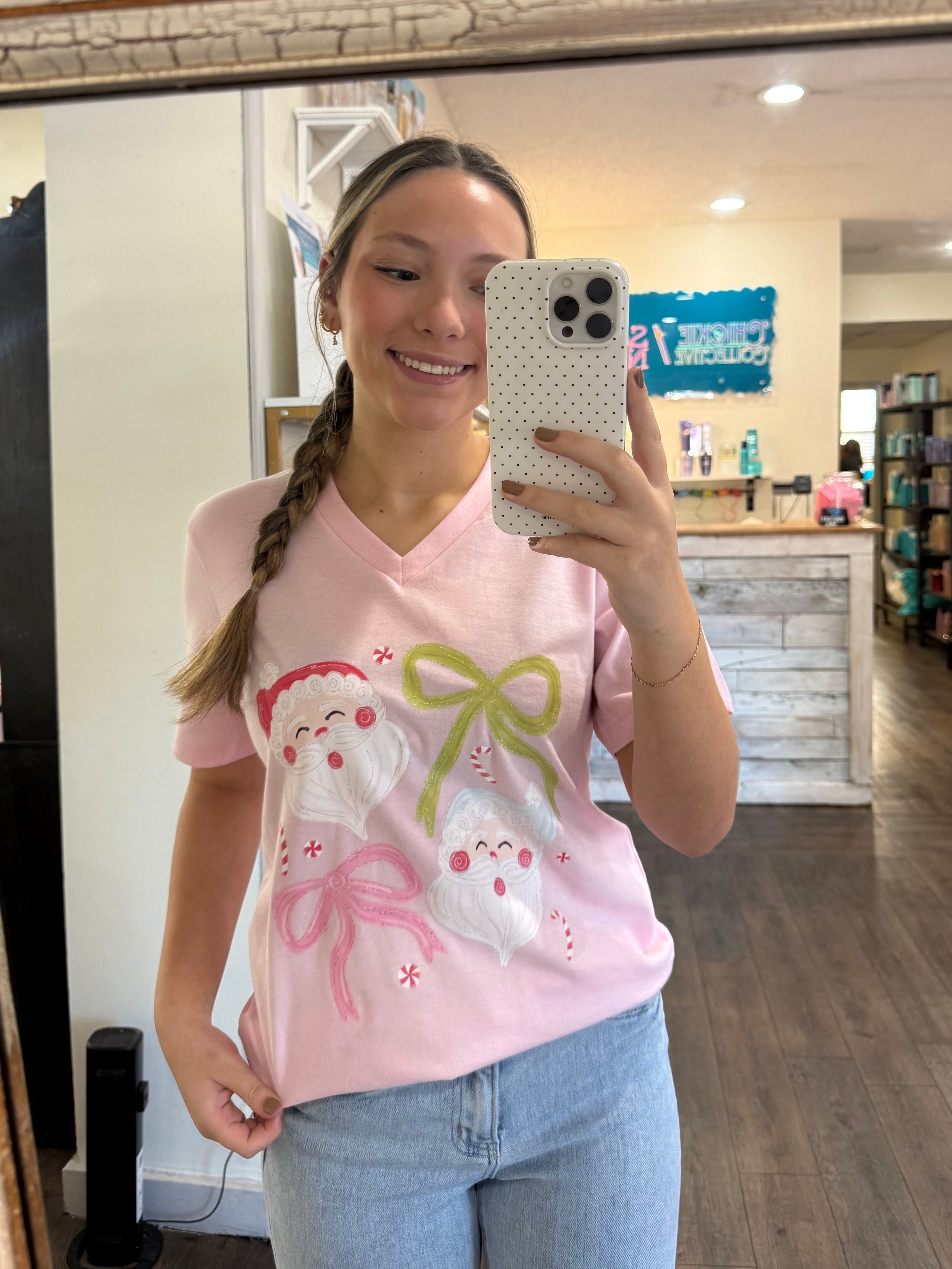 A Santa Claus and Bow design on a light pink v-neck shirt for women - adorable for the Christmas season!