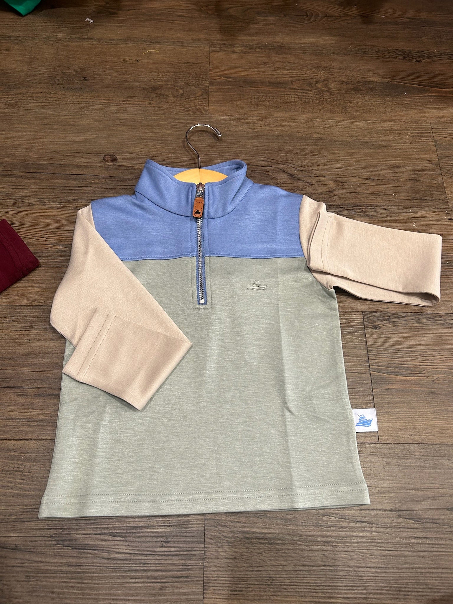 Blue/Green/Khaki Boys Pullover—a bold color-block statement that pairs fashion with everyday comfort. Expertly crafted with a unique blend of blue, green, and khaki, this pullover adds a pop of color to his wardrobe while keeping him warm and ready for anything.