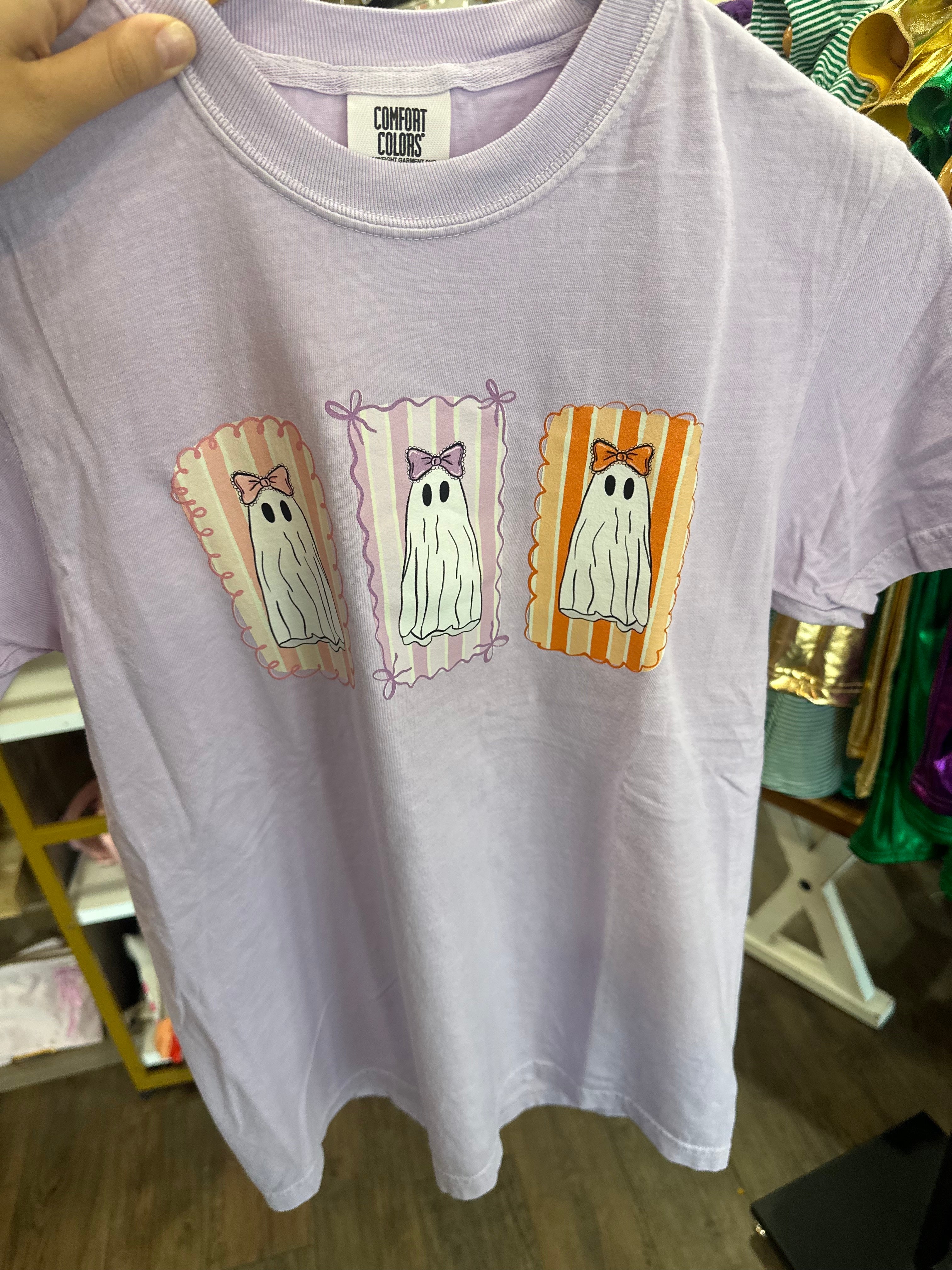 Introducing the Ghost Trio Lavender Adult Tee from Comfort Colors—a playful graphic tee designed for casual days and easy style. Featuring a trio of ghost stamps in orchid on a lavender base, this tee brings a subtle pop of color to everyday outfits.