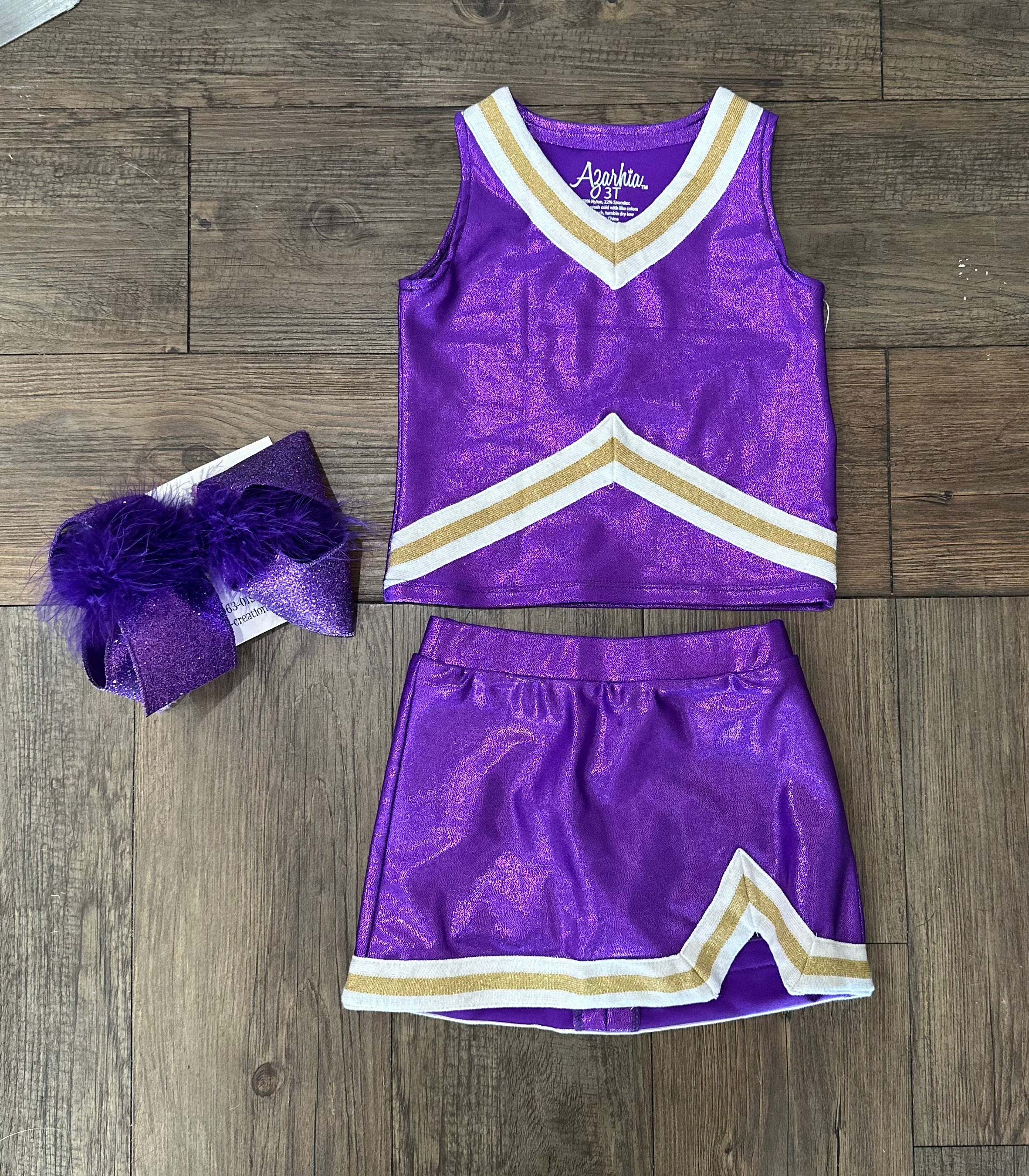 Meet the Shimmer Cheer Suit in Purple and Gold—a sparkling, kid-friendly cheer outfit designed for young girls who love to cheer on their team. Perfect for game days, school pep rallies, and competitions, this suit helps your little one stand out with confidence and style.