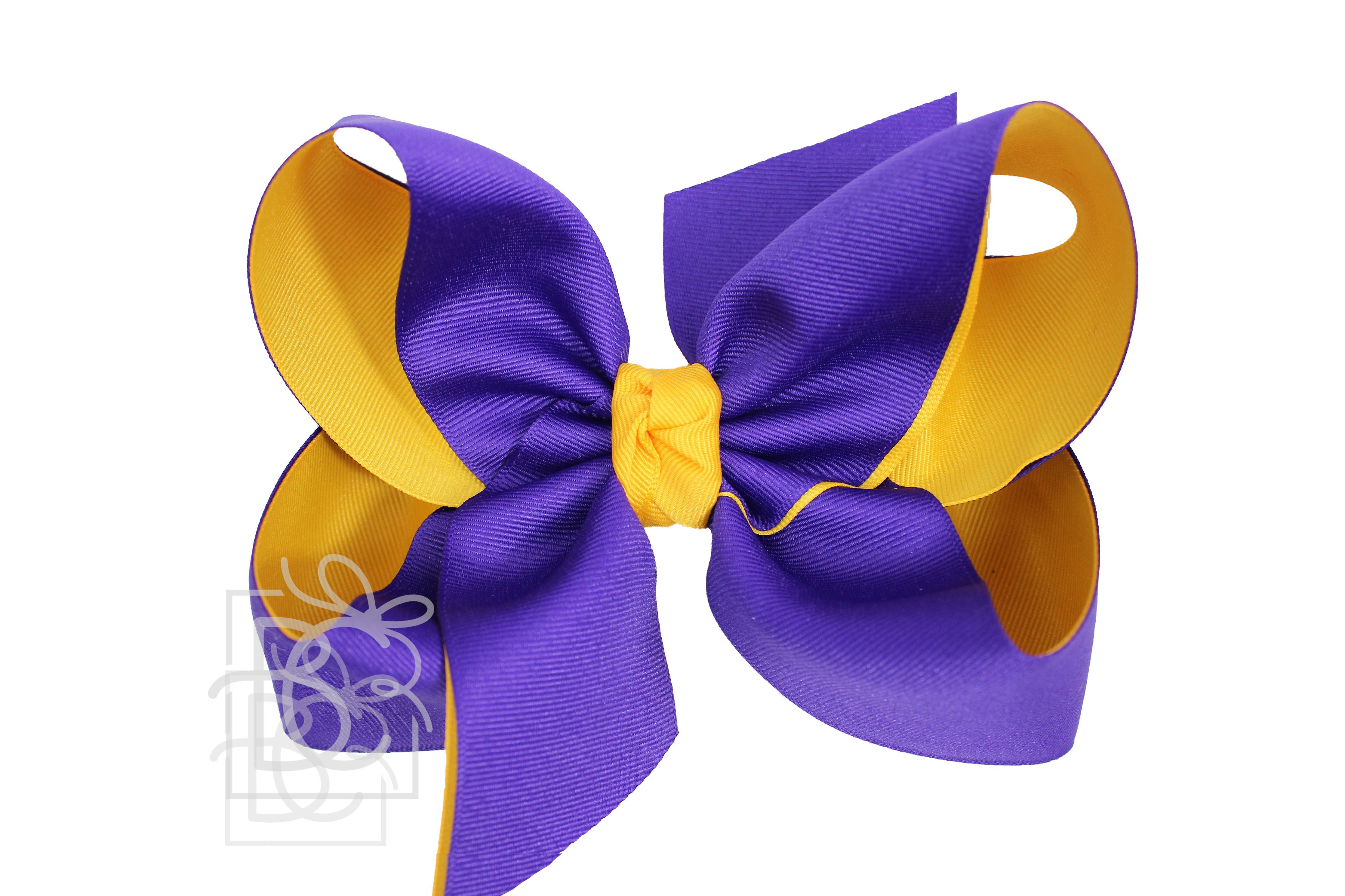 Layered Purple and Yellow Gold Grosgrain Bow is the perfect accessory for your little champion's game day outfit! Made with high-quality grosgrain ribbon, this stunning bow features a vibrant combination of purple and yellow gold, embodying school spirit and style.