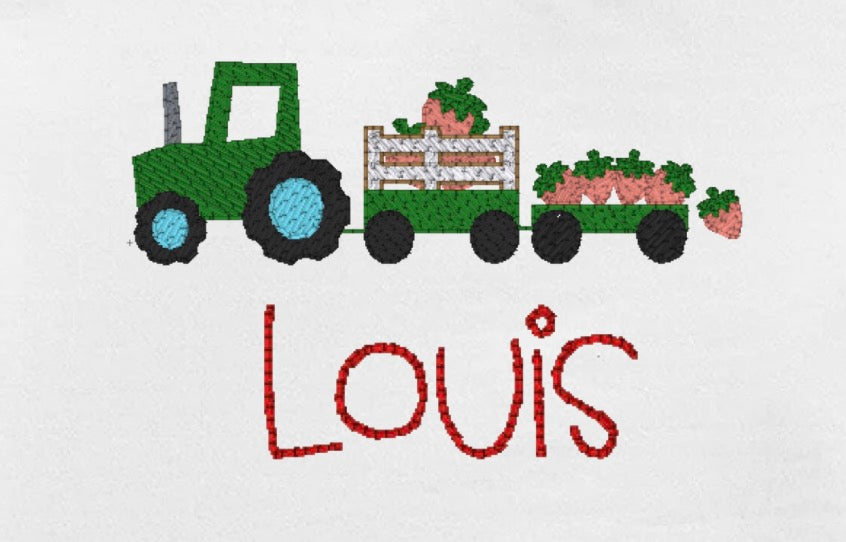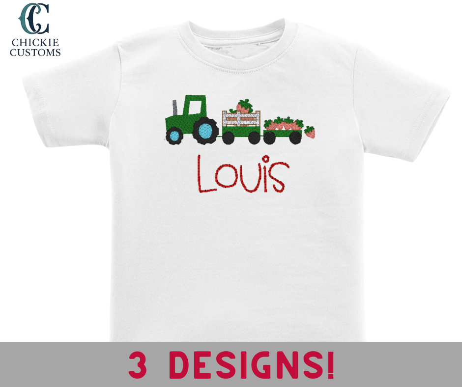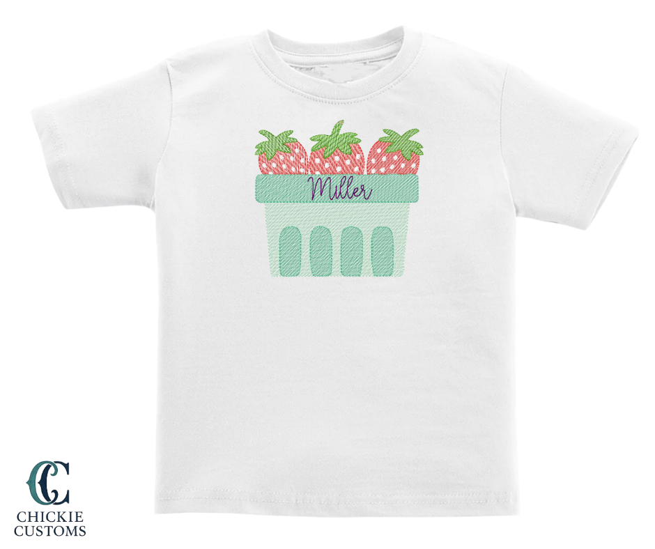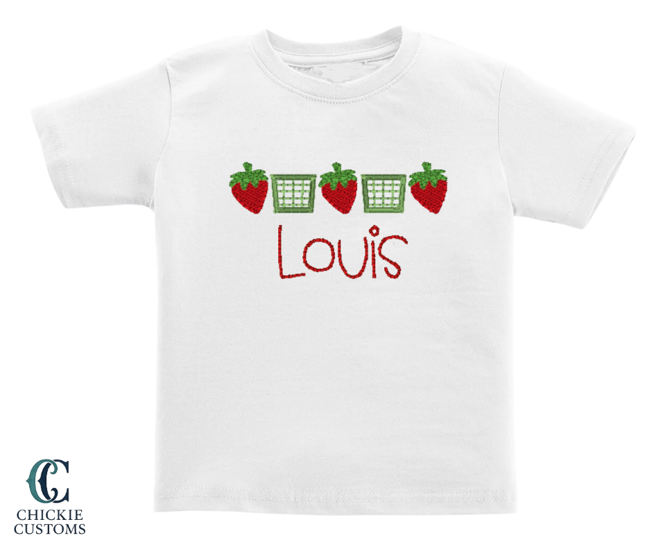 This classic boy white tee features custom strawberry embroidery and can be personalized with your little one’s name. Each piece is made to order with high-quality embroidery for a festive Strawberry Fest look.
