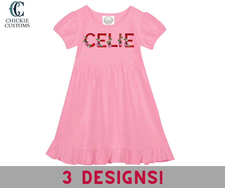 This darling pink bubble cotton dress features custom strawberry embroidery and can be personalized with your child’s monogram or name. Each dress is made to order with high-quality stitching, creating a keepsake piece that’s perfect for Strawberry Fest photos, twirling through the festival, and sweet spring celebrations.
