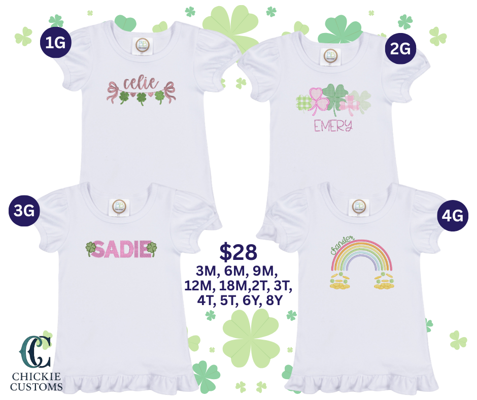 Choose your favorite St. Patrick’s design — shamrocks, bows, name appliqué, or rainbow — and personalize it for a custom look made just for her.