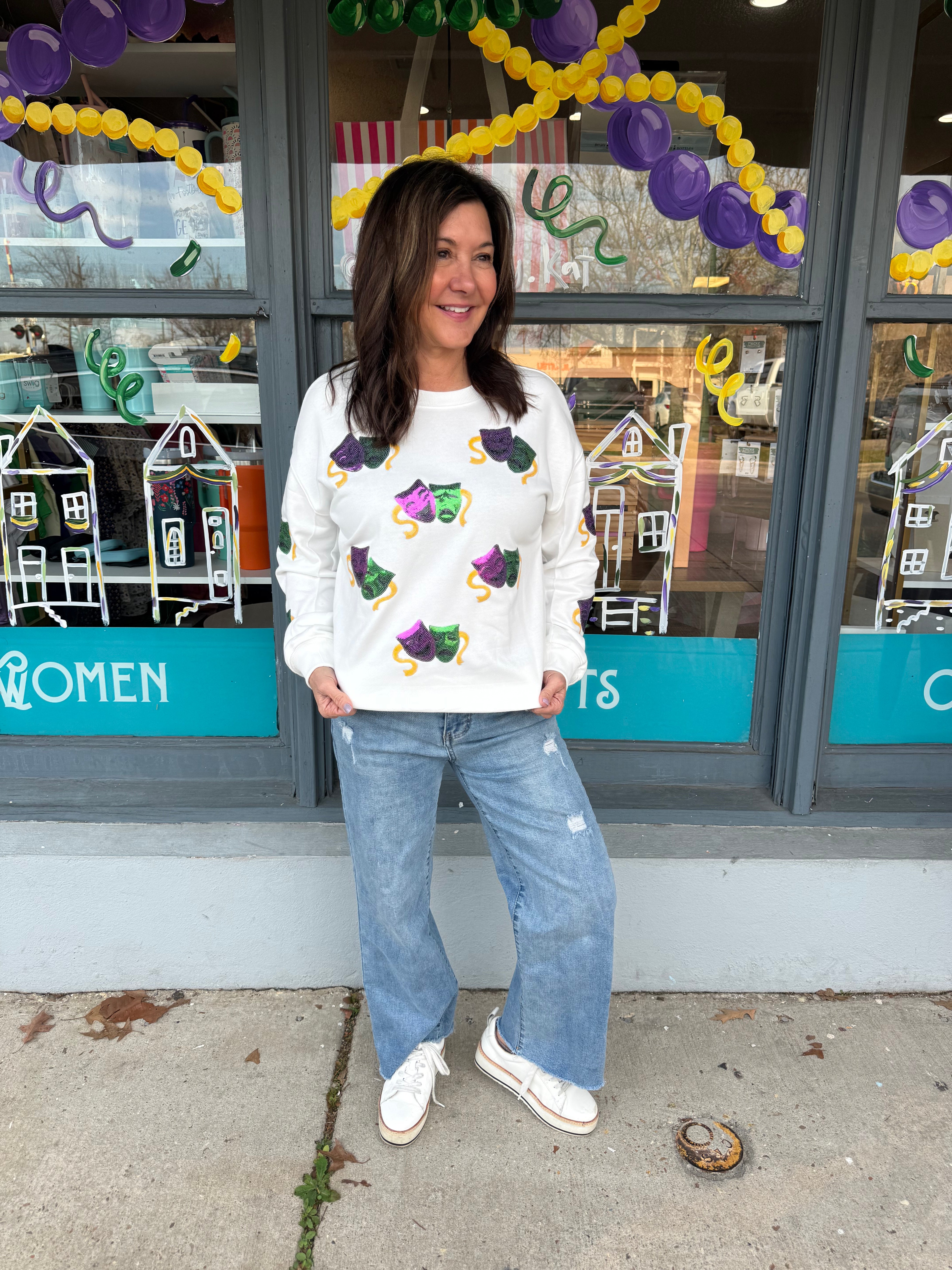 This cute sequin sweatshirt is perfect for the Mardi Gras season and the cold weather!
