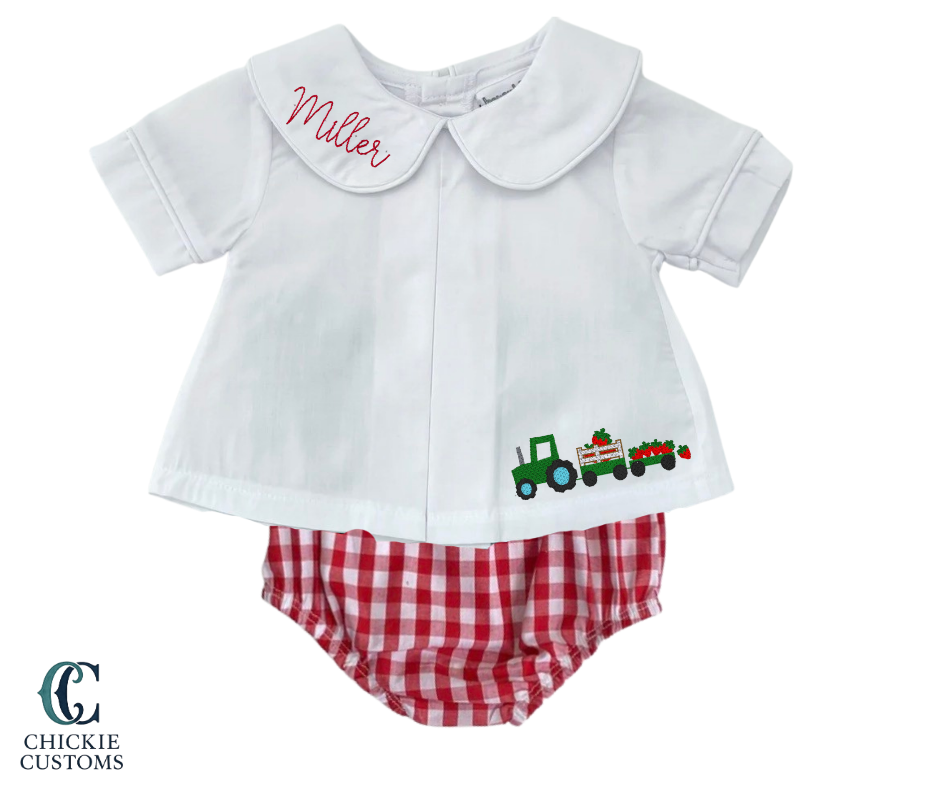 This timeless baby boy collar shirt features custom strawberry embroidery and can be personalized with your little one’s monogram. Each shirt is made to order with premium embroidery for a polished Strawberry Fest look.