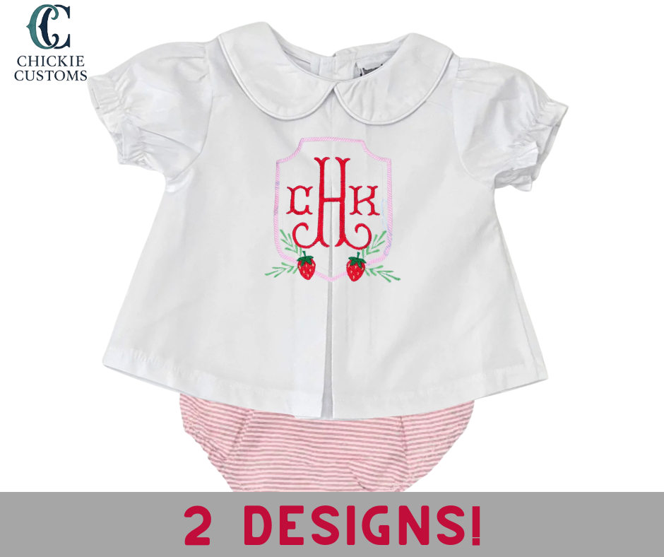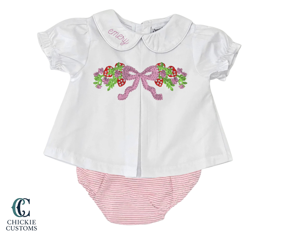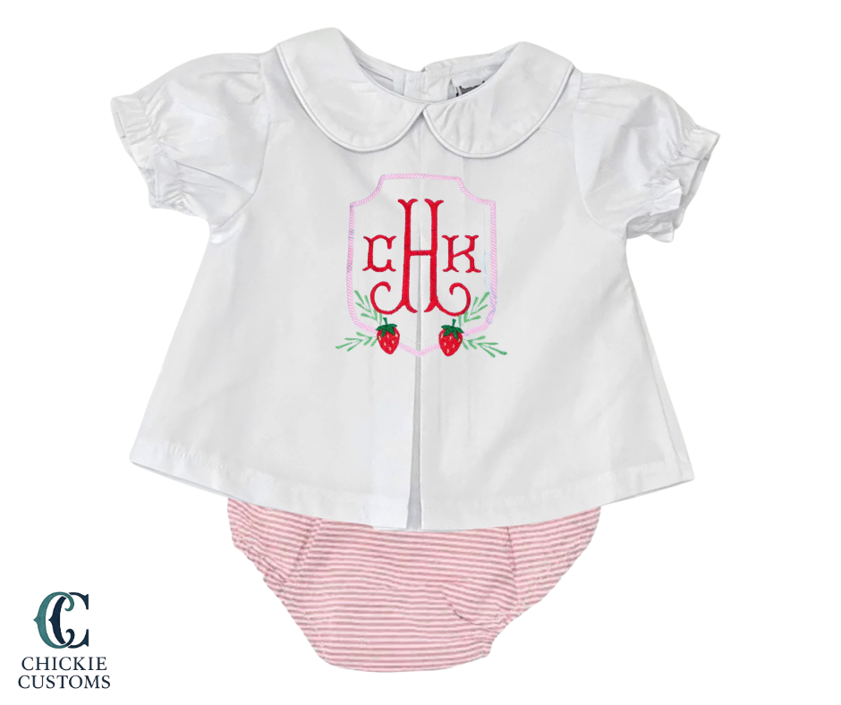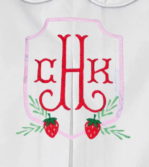 This classic collar shirt features custom strawberry embroidery and can be personalized with your little girl’s monogram. Each piece is made to order with premium embroidery for a special Strawberry Fest look.