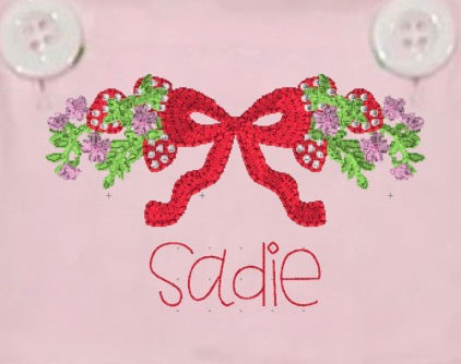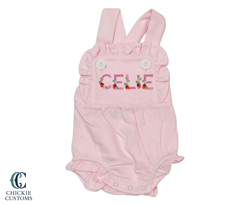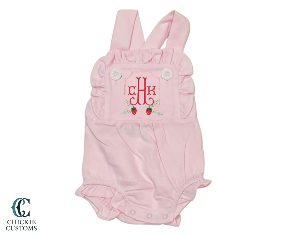 This classic baby girl pink sun suit features custom strawberry embroidery and can be personalized with your little one’s monogram. Each piece is made to order with high-quality embroidery for a festive Strawberry Fest look.
