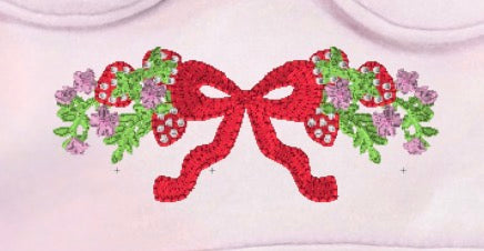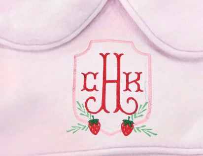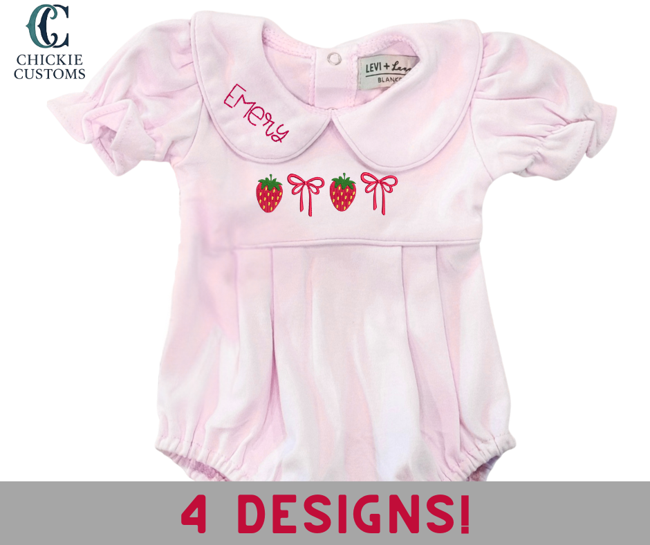 This classic baby girl pink bubble features custom strawberry embroidery and can be personalized with your little one’s monogram. Each piece is made to order with high-quality embroidery for a festive Strawberry Fest look.